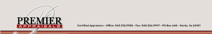 Premier Appraisals • Certified Appraiser Services • Office 540.312.9958 • Fax 540.526.9997 • PO Box 640 • Hardy, VA 24101 • www.smlpremierappraisals.com Southwest Virginia residential and commercial real estate appraisal services for Amherst County, Appomattox County, Bedford County, Botetourt County, Campbell County, Franklin County, Henry County, Patrick County, Pittsylvania County, Roanoke County, City of Lynchburg, City of Martinsville, City of Roanoke, City of Salem, and City of Vinton.
